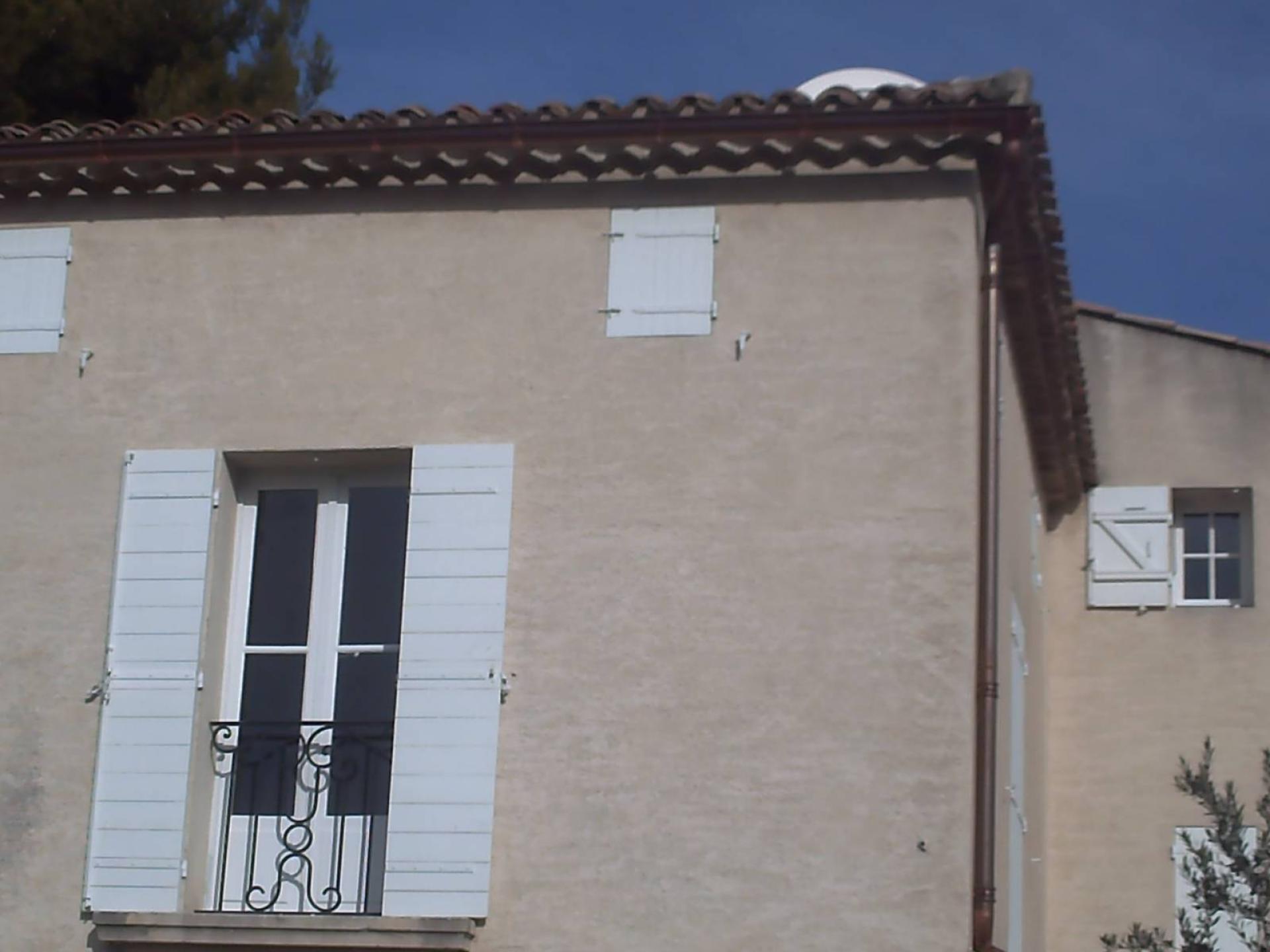 Les Charpentiers du Lubéron ont réalisé la pose de gouttière cuivre avec descente en cuivre également, sur une maison de Provence, afin de conserver le charme de la propriété et préserver les façades.