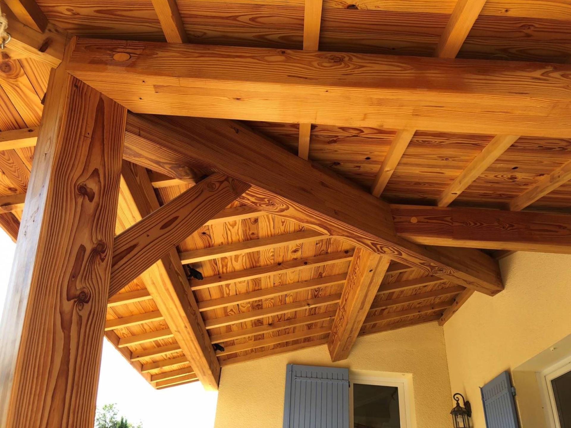 Les Charpentiers du Luberon, ont été contactés pour la réalisation d’une terrasse couverte un peu particulière sur Pertuis. En effet, le poteau de soutènement est incliné, cela donne à cette terrasse un style différent, qui change de ce que l’on voit habituellement et qui lui donne beaucoup de charme. La charpente taillée par une de nos équipes et en lamellée collée. On peut voir le plancher volige réalisé en sous couverture.